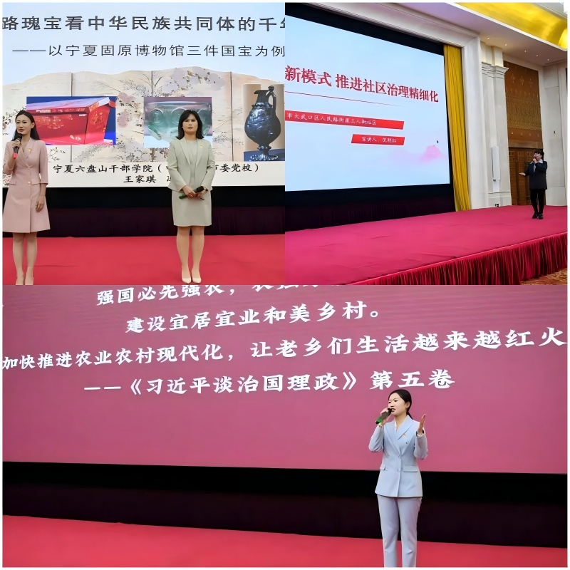 圍繞鑄牢中華民族共同體意識、基層治理、鄉(xiāng)村全面振興3個專題,邀請寧夏六盤山干部學院、固原市委黨校教師王家琪、馮靜,石嘴山市大武口區(qū)人民路街道工人街社區(qū)黨委書記倪艷紅,固原市涇源縣委黨校教師、涇源縣大灣鄉(xiāng)副鄉(xiāng)長(掛職)明雪,分別作《從絲路瑰寶看中華民族共同體的千年交融——以寧夏固原博物館三件國寶為例》《基層“七微”新模式 推進社區(qū)治理精細化》《牢記囑托勤奮斗 楊嶺嬗變換新顏》案例宣講,通過身邊典型案例剖析、可見可感的鮮活故事分享,生動闡釋學習貫徹的實踐路徑和轉化成果,以案促學、以講促效。