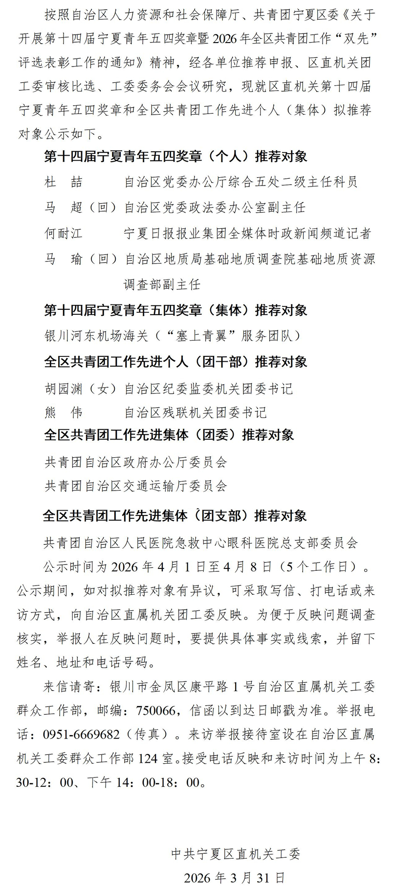 關(guān)于區(qū)直機(jī)關(guān)第十四屆寧夏青年五四獎(jiǎng)?wù)潞腿珔^(qū)共青團(tuán)工作先進(jìn)個(gè)人(集體)擬推薦對(duì)象的公示